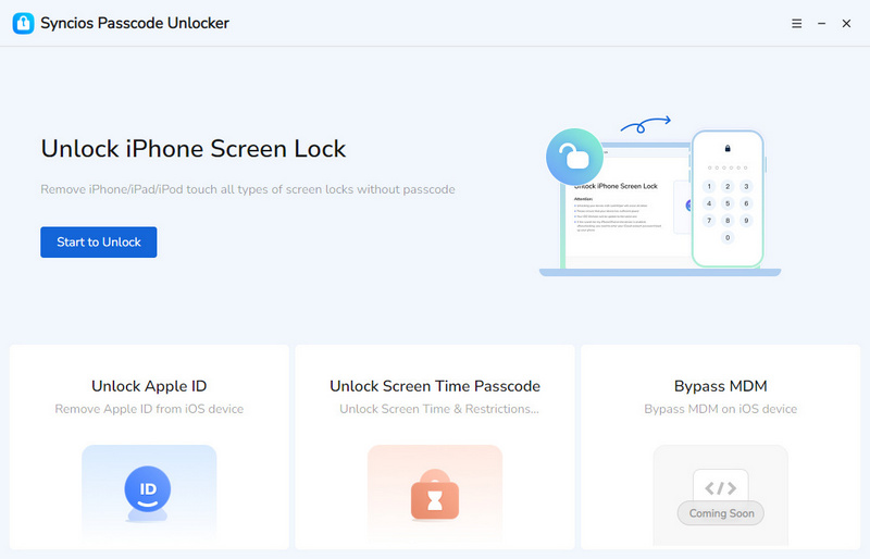 Syncios Passcode Unlocker is a versatile solution for iOS device owners facing access restrictions. It empowers users to remove screen passcodes (including 4/6-digit codes, Face ID, and Touch ID), bypass iCloud Activation Locks caused by forgotten Apple IDs or pre-owned devices, and erase MDM profiles from enterprise-managed iPhones or iPads. Compatible with all iOS versions and devices, the tool offers two modes: Screen Passcode Removal (preserves data if the device is detectable via iTunes) and iCloud/MDM Removal (requires factory reset).