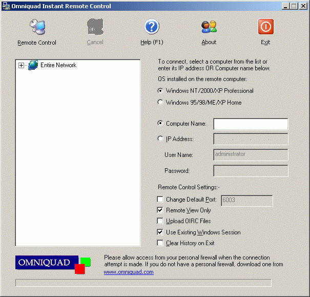 Powerful network administrative tool-enables total control of PCs on your network instantly without having to install any software on remote PCs-valuable tool for system administrators/IT Managers to view/access employee PCs over corporate LANs-no need for multiple licenses-requires to be installed only on the administrator's computers used to control other PCs-a single license can support large networks-no warning displayed at remote end-creates a tree of all computers on your network automatically-manually enter IP details and access PCs not listed as well-works by sending a preconfigured host to a would-be host machine-the host application runs as a service on the remote machine, so your system need not be left logged on to be accessible-work on the remote machine as if seated in front of it-all remote mouse and keyboard functions get transferred-access remote disk, navigate or move files seamlessly on remote PCs using standard Windows keyboard commands-change remote host settings,reboot and log back onto its OS-convenient mini toolbar to execute functions such as fitting the remote display to the entire client screen, changing the colour display mode, using the FTP Service to transfer files to and fro, switching remote access mode to view/full control, and to execute remote lock as well as sending Ctrl+Alt+Del to the remote machine-the FTP option functions the same way as the standard Windows FTP Service-sends/receives images in 8 bit (256 colour) mode by default to optimize transfer speed