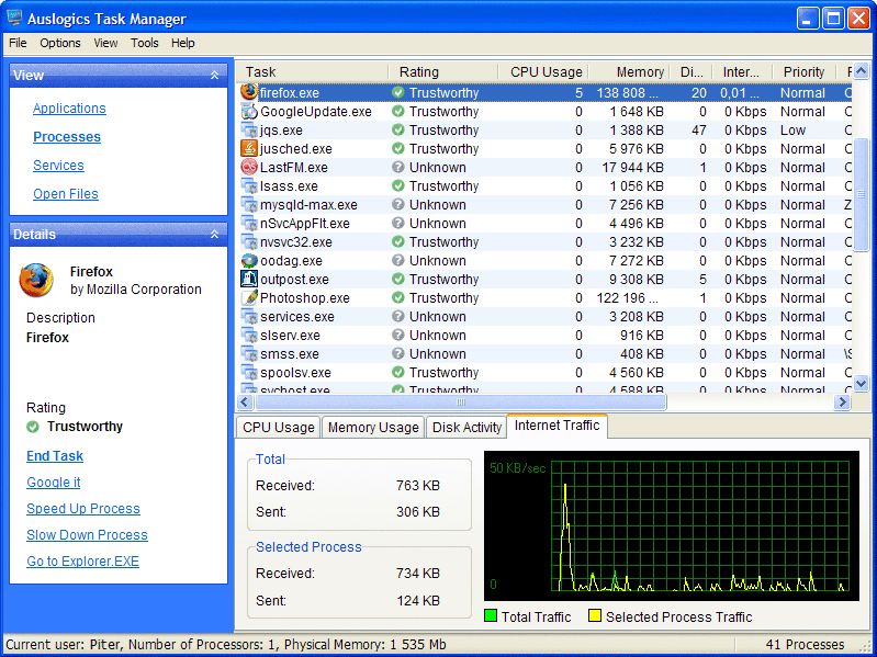 Auslogics Task Manager shows how much CPU, RAM, Disk Usage or Internet bandwidth is used by the processes running on your computer. The program will also show you the services and open files; you will be able to see which programs keep which files open. It can also help you to find trojans hiding in the legitimate processes, such as explorer.exe.