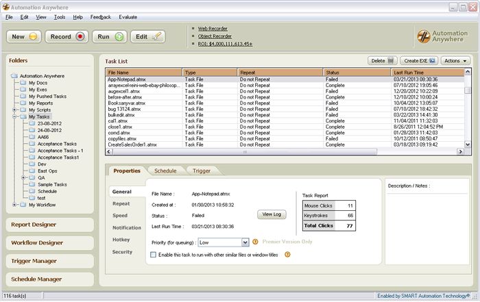 Automation Anywhere is an intelligent automation software for IT & business processes. Automate & schedule complex tasks in minutes, without any programming. Record keyboard & mouse or create automation scripts with drag and drop actions. Features SMART Automation Technology(r), scheduler, repeat options, web recorder, variable & debugging support, task-chaining, conditional, file, system, database & Internet commands, single click web data extraction & web mining, Turbo-speed, IE plug-in & more.