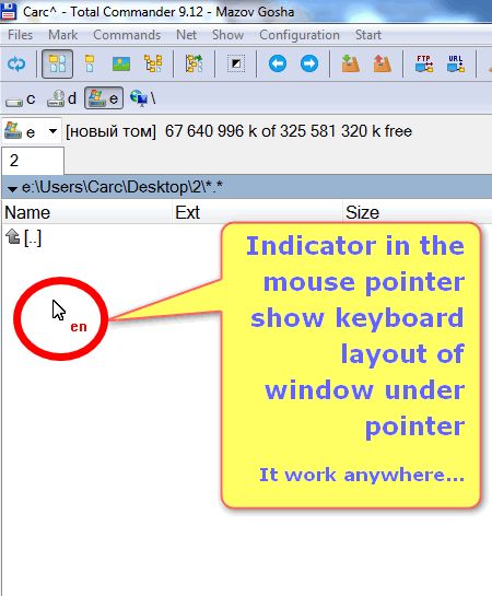 The indication in the text cursor is done by changing its color and indicating the language name to or below of the cursor. The cursor width is also configurable. The indication in the mouse pointer is done by showing either the language name or country flag next to the mouse pointer.