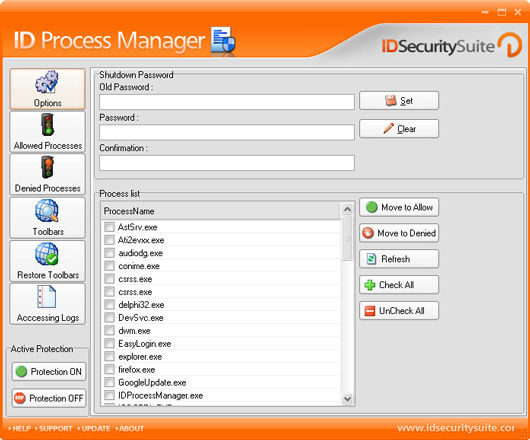 - ID Process Manager further protects your computer by giving you the opportunity to password-protect your shutdown process. You can choose this option to prevent loss of unsaved information if a different user or application tries to shutdown your system.