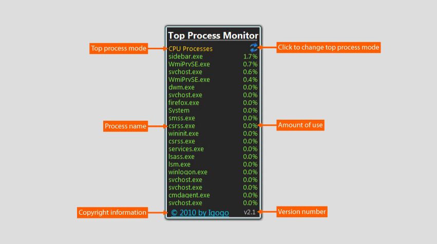 Top Process Monitor is a tiny gadget that allows you to view the processes which are using most of your CPU, memory and critical components of your system. It can be easily installed and configured, even by less experienced users. The interface of the app is based on a small frame that you can move to any position on the screen. So, you can check out the current CPU level, along with the applications and the total number of included threads. Top Process Monitor comes with several configurable settings. So, you can select the to processes mode between CPU, memory, PageFiles, Virtual Memory, I/O, read, write, total read and total write. But you can also adjust the size of the frame or make Top Process Monitor automatically do that, set the refresh rate and number of processes to show, as well as establish the double-click action (Task Manager, Resource Monitor, Performance Monitor, or none). On top of that, you can make Top Process Monitor cycle through all the aforementioned modes on click, display a warning if the resources usage is above a certain level, customize frame colors, switch to a different language for the UI, as well as restore all settings to their default values. The simple-to-use program does not put a strain on the computer, as it uses a low amount of CPU and system memory. It has a good response time and didn't freeze, crash or pop up errors during our testing. Thanks to its wide range of customization features, skilled users can definitely get a kick out of Top Process Monitor.