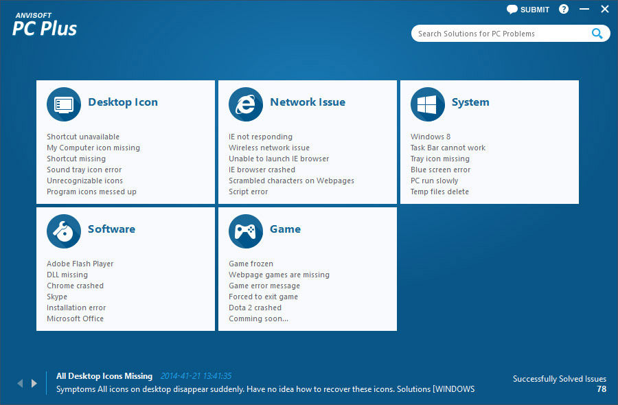 With One-Click solution, Anvisoft PC Plus can help you retrieving disappearing desktop icon, fixing game issue, solving Network error, and repairing software and system problem easily and efficiently. And if your problem not solved you can submit us a feedback, we will help you out as soon as possible.