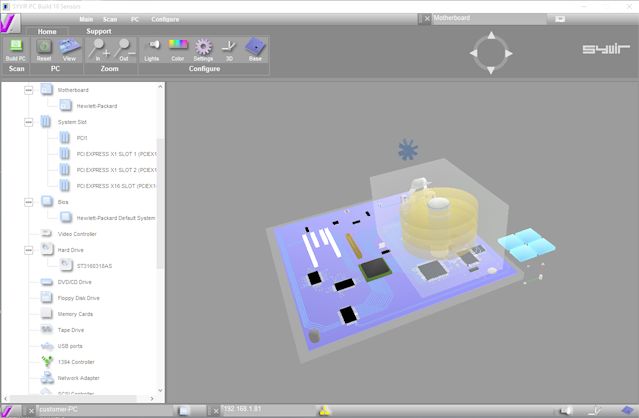 Syvir PC Build is for pc inventory. When trying to check a PCs hardware specification sometimes the only reliable means is to open up the box and see for yourself what's inside the system case. Clearly this is time consuming and can be impractical. Syvir PC Build scans your computer for a list of hardware inventory. Over 30 hardware sensors return a hardware list and create a virtual PC of your system. PC Build Returns the processor that is used in the PC. Memory banks. Hard drive part nos. Builds a list of USB ports serial and parallel ports.Once the computer has been scanned a list of hardware components is created. You can quickly see key hardware names such as processor name hard disk part number which version of windows is installed on the target PC.A 3D Version of the motherboard is built this is populated with processor, hard drives, optical drives and all the major hardware components fitted on your motherboard.