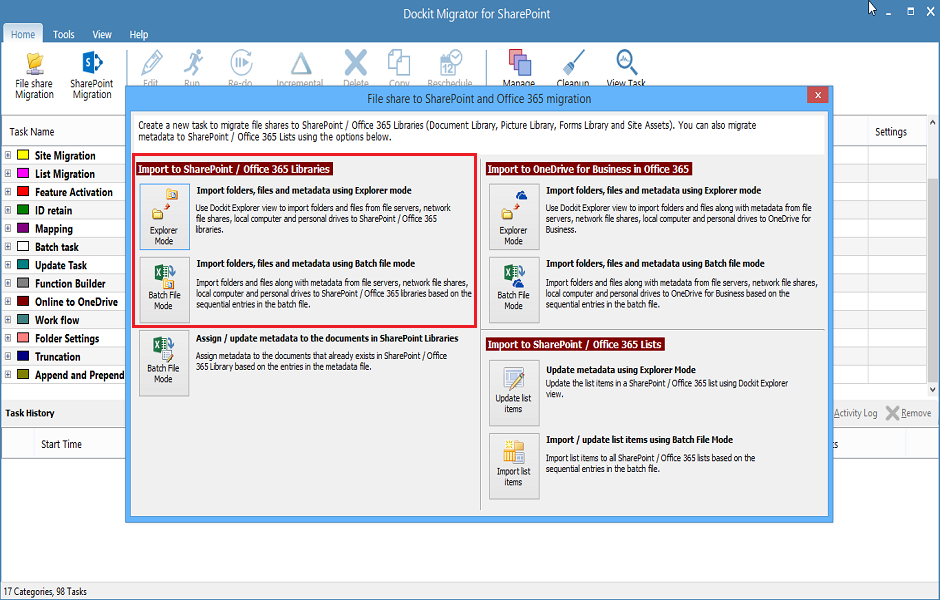 Migrate to SharePoint 2016/2013/2010/2007/Office 365/OneDrive for Business using Vyapin Dockit Migrator for SharePoint. You can migrate SharePoint and file share content to SharePoint servers and SharePoint Online / OneDrive for Business (Office 365) using this product. 6th generation SharePoint migration solution supporting SharePoint 2001 / 2003 / 2007 / 2010 / 2013 / 2016. Handles a variety of migration scenarios - both simple and complex, with its rich and powerful feature set. One of the very first file share to SharePoint migration