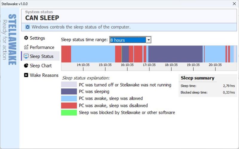 Usage patterns are also logged: you can check out how much your PC is used actively and how much time it spends in sleep, how much sleep time has been prevented. Wake reasons are also logged: easier to investigate and fix root causes of unwated sleep interruptions. Save more power with StellaWake.