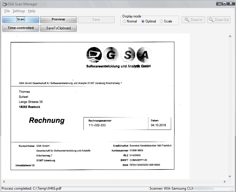The GSA Scan Manager program allows you to scan documents, images and slides by using the twain interface. The Output format can be defined as BMP, JPG, PNG or PDF. A compression level for lossy file format can be set and different scanning methods can be used (preview, single scan and time-controlled multi-image scanning).