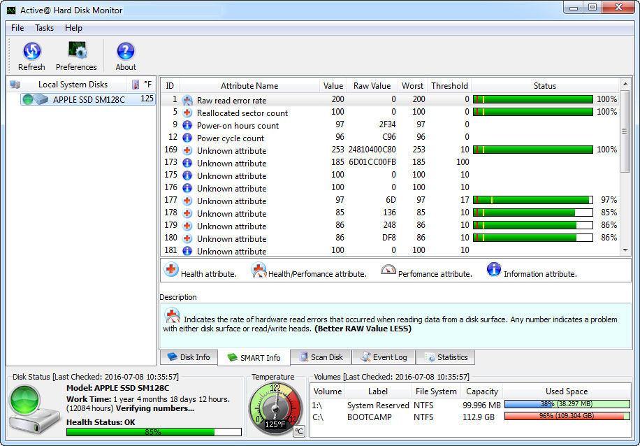 Active@ Hard Disk Monitor is a freeware disk utility that monitors the status of your hard drives and scan for bad sectors. The system is based on the Self-Monitoring Analysis and Reporting Technology (S.M.A.R.T.). This software monitors hard disk parameters such as Temperature, Head Flying Height and Spin-Up Time and notifies a user when a critical condition occurs. Disk Monitor also displays hard disk information, current S.M.A.R.T. attributes and the overall status of the hard disk's health. Advanced disk scan allows you to detect bad sectors on a disk surface. The software can be launched automatically at Windows startup and monitor the system in the background. An icon in the System Tray can display the temperature for selected HDDs.