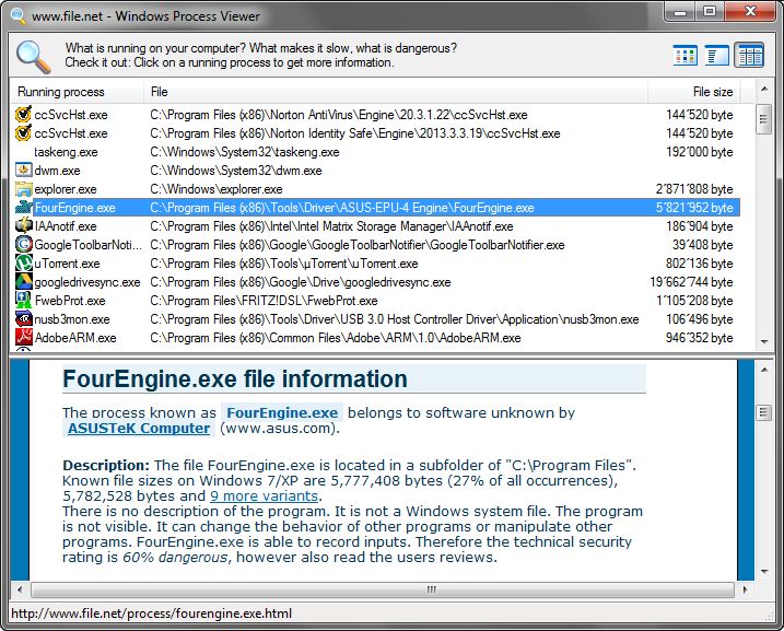 This free File.net Windows Process Viewer displays all running Windows processes on your computer. It shows the Windows file name, full folder path and file size. If you click a process, the file checker connects to the File.net online database for additional process information including the real name of the process and the name of the developer. Additionally, you see the default and expected folder path. So you can check if your process is the original Windows system process in the right folder or if it's a fake, trojan process. Often attacked Windows files are svchost.exe, lsass.exe, ctfmon.exe, csrss.exe, alg.exe, wmiprvse.exe, wisptis.exe and wuauclt.exe.