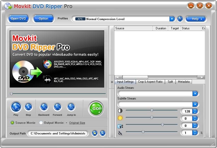 Movkit DVD Ripper Pro is DVD converter, DVD ripper, DVD rip software to convert DVD, rip DVD to VCD, DVD to DivX, DVD to MPEG, DVD to WMV, DVD to AVI, DVD to WMA, DVD to MP3 easily and quickly with excellent image/sound quality.Movkit DVD Ripper Pro is the best DVD ripping software, rip DVD to all popular video/audio formats.It helps you rip your DVDs to AVI(XVid,DivX), WMV, RMVB, MP4, FLV, MOV, 3GP, MPEG, VCD, SVCD files etc. Supports ripping by custom file size, The software also supports preview. In addition, it allows you to choose an audio channel and subtitle to rip which is convenient when ripping multi-language movies. Easy to use DVD converter, DVD rip software with high DVD ripping speed, can rip DVD, convert your favorite DVD movie to all most popular video/audio formats such as DVD to AVI, DivX, MPEG, VCD, MP4, WMV, MP3, WMA, WAV, ogg, flac, mpc, aac etc.