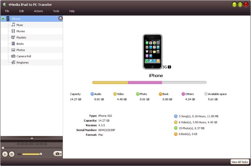Powerful iTunes alternative, 4Media iPad to PC Transfer not only transfers media files from your computer to iPad just like iTunes, but it can also copy video and audio files from iPad to your computer or iTunes library for backup. The file transfer functionalities are applicable to all iPad/iPhone/iPod types including iPad Wi-Fi, iPad Wi-Fi+3G, iPad 16GB, iPad 32GB, iPad 64GB, iPhone, iPhone 3G, iPhone 3GS, iPod touch, and others.Now it can support iTunes9.2 and iOS 4.