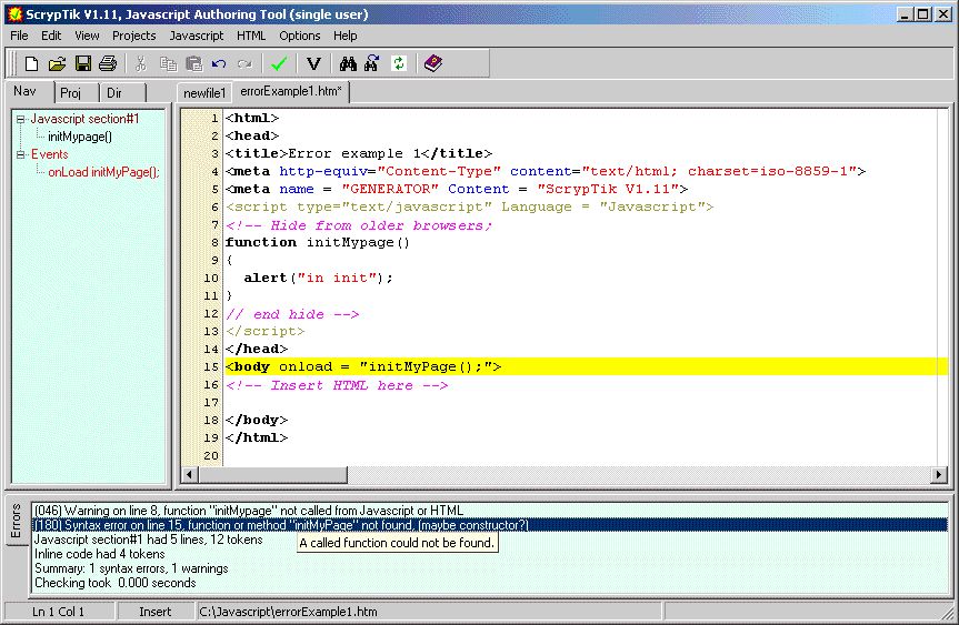 Javascript authoring tool that can edit multiple files. Editor has color syntax highlighting and always shows line numbers. Many pieces of Javascript and HTML template text may be inserted from menus. All Javascript code is extracted and syntax checked and checked for integration to the surrounding HTML objects. Programmer friendly lists of ascii codes and Javascript code tree to help the developer. Tree dispay of all global variables, functions, HTML named objects and events (eg onclick) to left of editor for information and navigation. Selecting any tree item or error in the error list positions the editor to the appropriate line and highlights it.