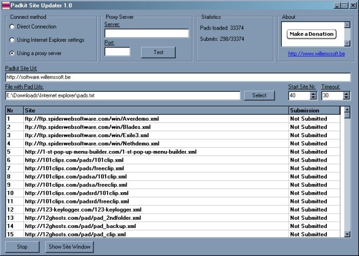 Padkit Site updater is a program for webmasters running a padkit pad website. It is used to automatically populate the pad database starting from a text files with links to pad files. The program will then submit these links the specified padkit site. It's extremely usefull if you just started your padkit website and want to have some programs listed for starting.
